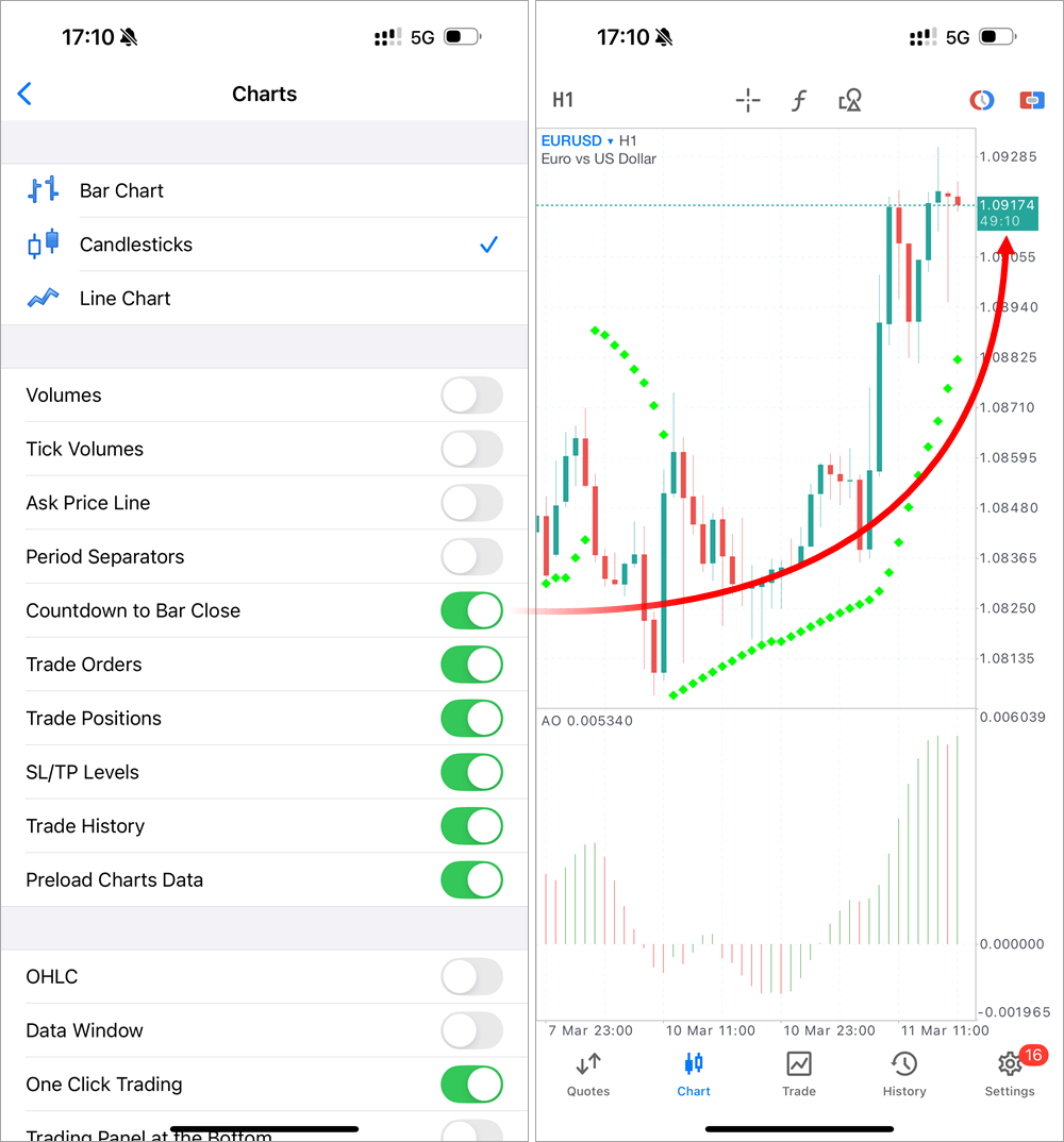 要启用计时器,请转到图表设置。倒计时显示在当前价格下方的垂直刻度上。